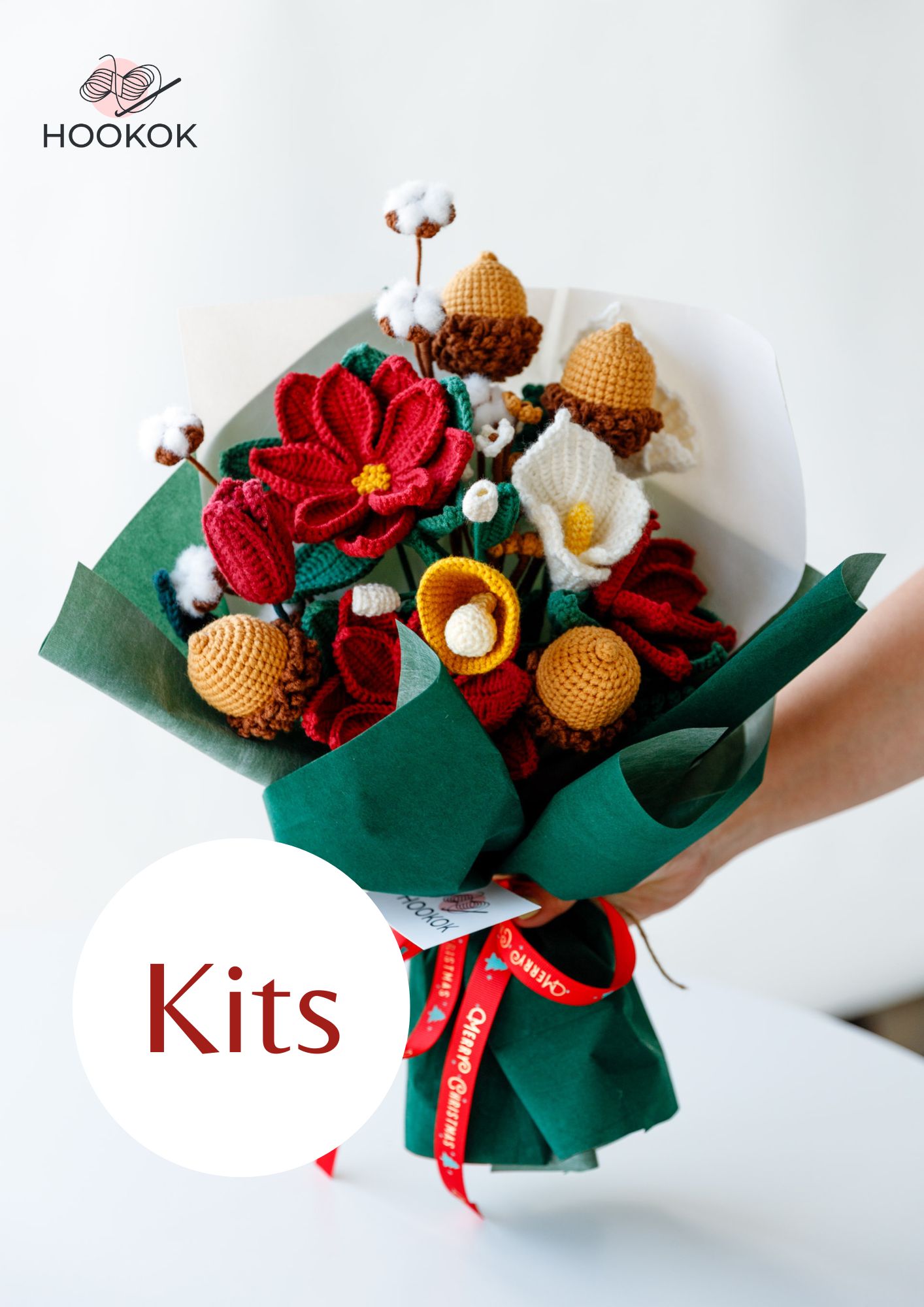 Our Christmas Flower and Bell Bouquet Kit include all the tools and yarns you need, very friendly for crocheters. In addition, we will offer you free patterns (a printed book and PDF) and video tutorial of the flowers. crochet flower bouquet kit, DIY crochet flower for Christmas gift.