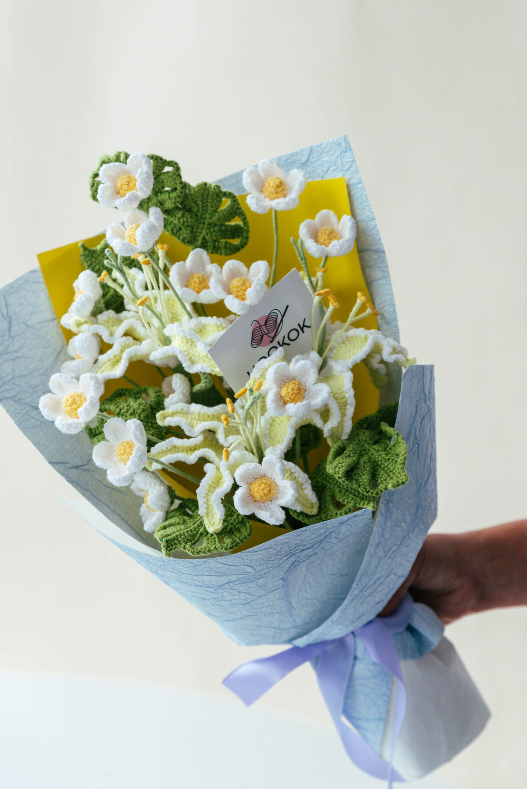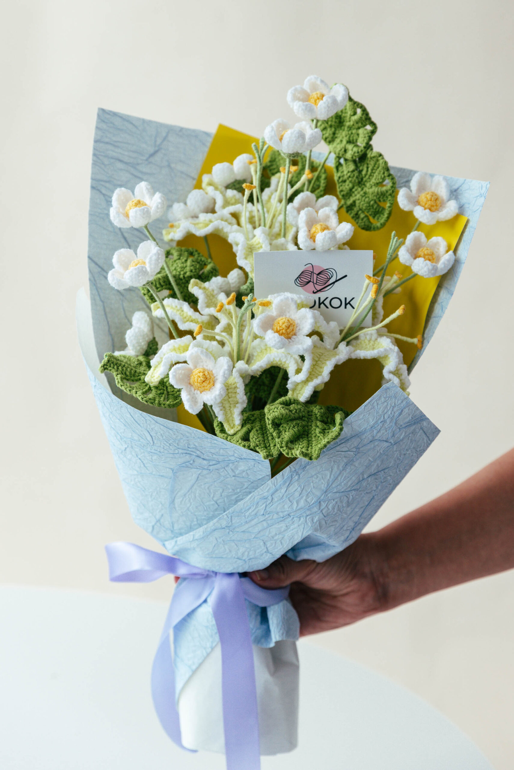 This is an all-in-one Crochet Creamy Yellow Flame Lily and Afghan Flower Bouquet Kit. With this one, you can crochet 3 creamy yellow flame lilies, 4 white Afghan flowers, and 3 small monstera leaves.