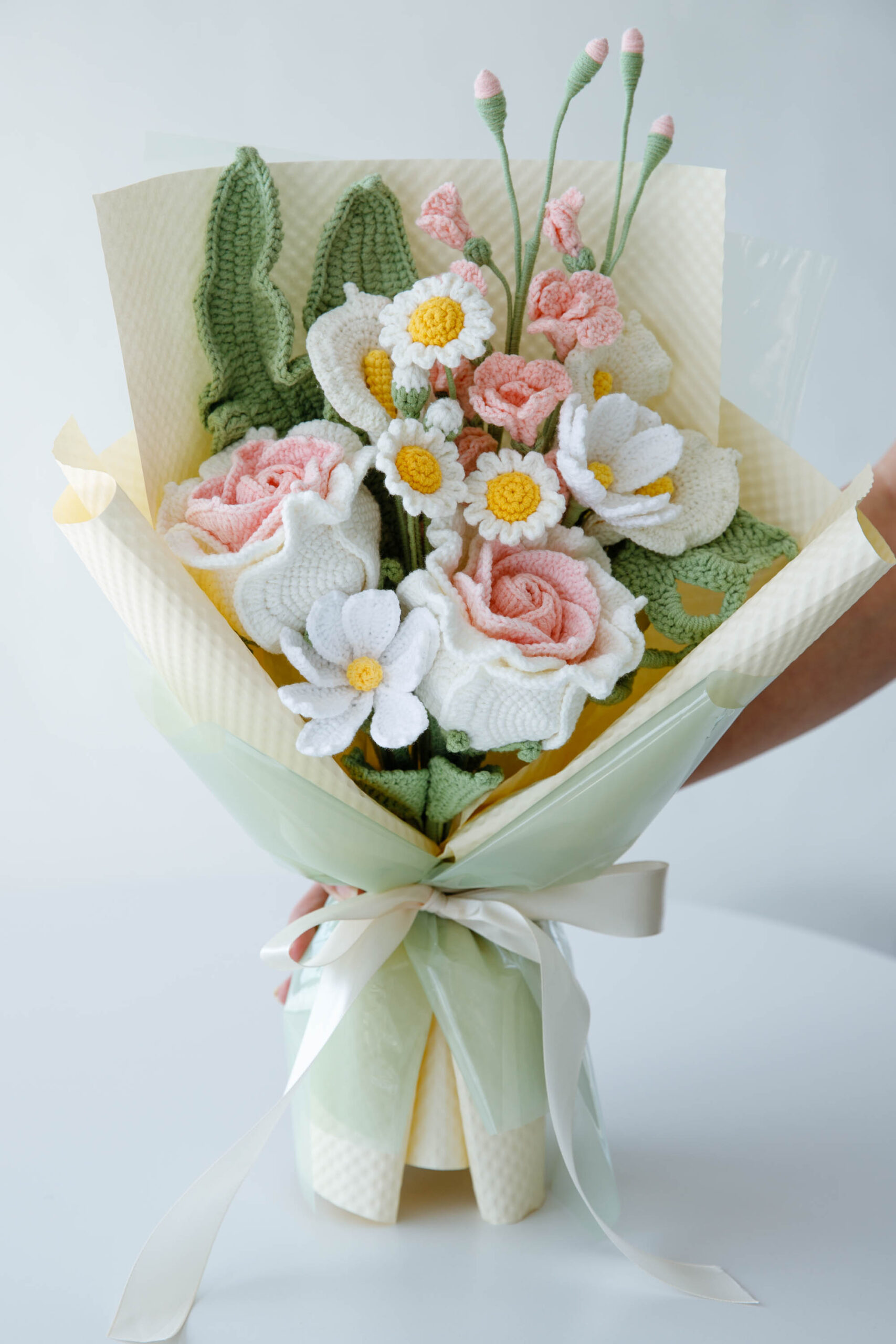 Our Crochet Gradient Pink Thai Rose and Freesia Bouquet Kit include all the tools and yarns you need, very friendly for crocheters. In addition, we will offer you free patterns (a printed book and PDF) and video tutorial of the flowers. DIY crochet flower at home, crochet flower bouquet kit.