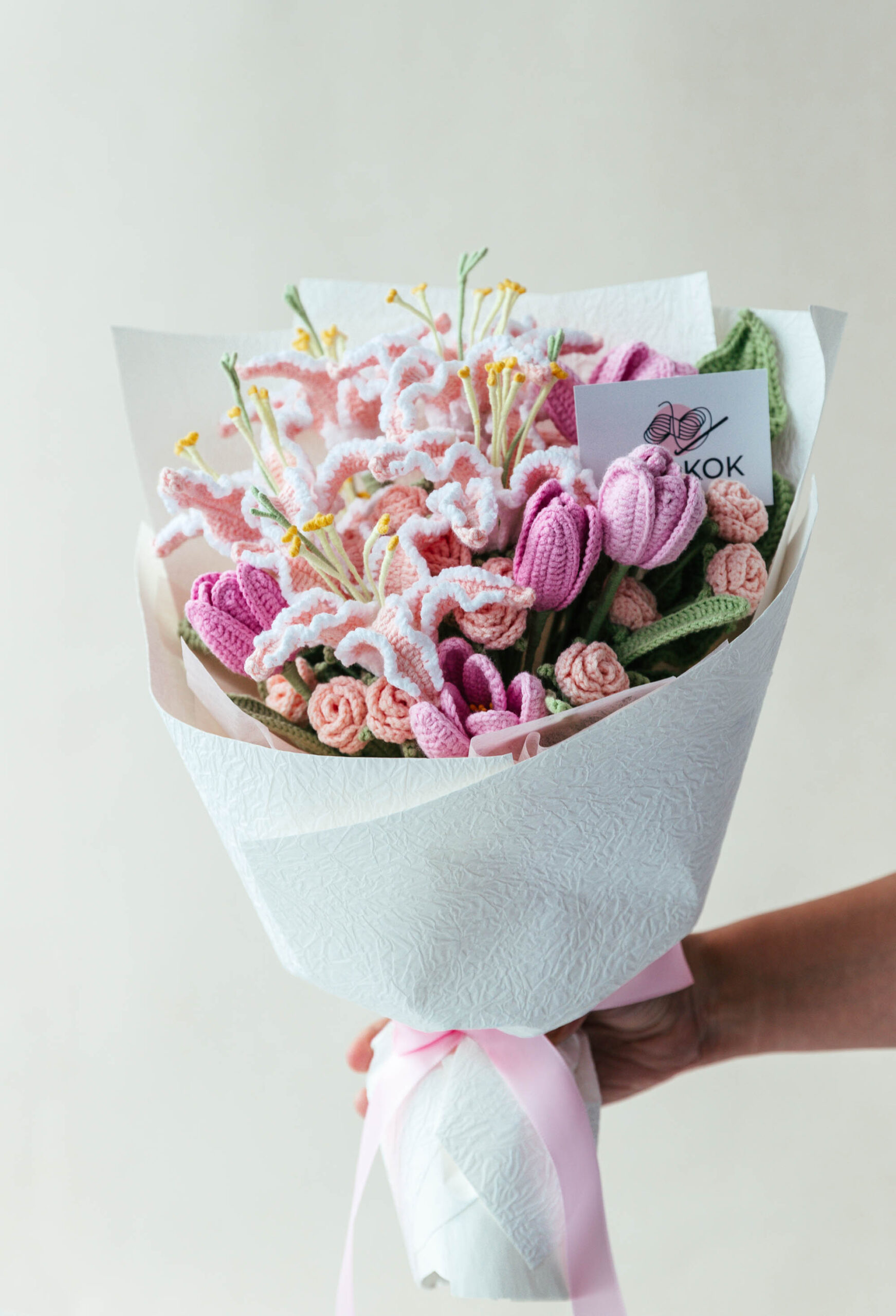 100% hand-made Crochet Pink Flame Lily and Rose Bouquet. If you want personalized bouquets or special colors, leave us a message or contact us for customized orders.