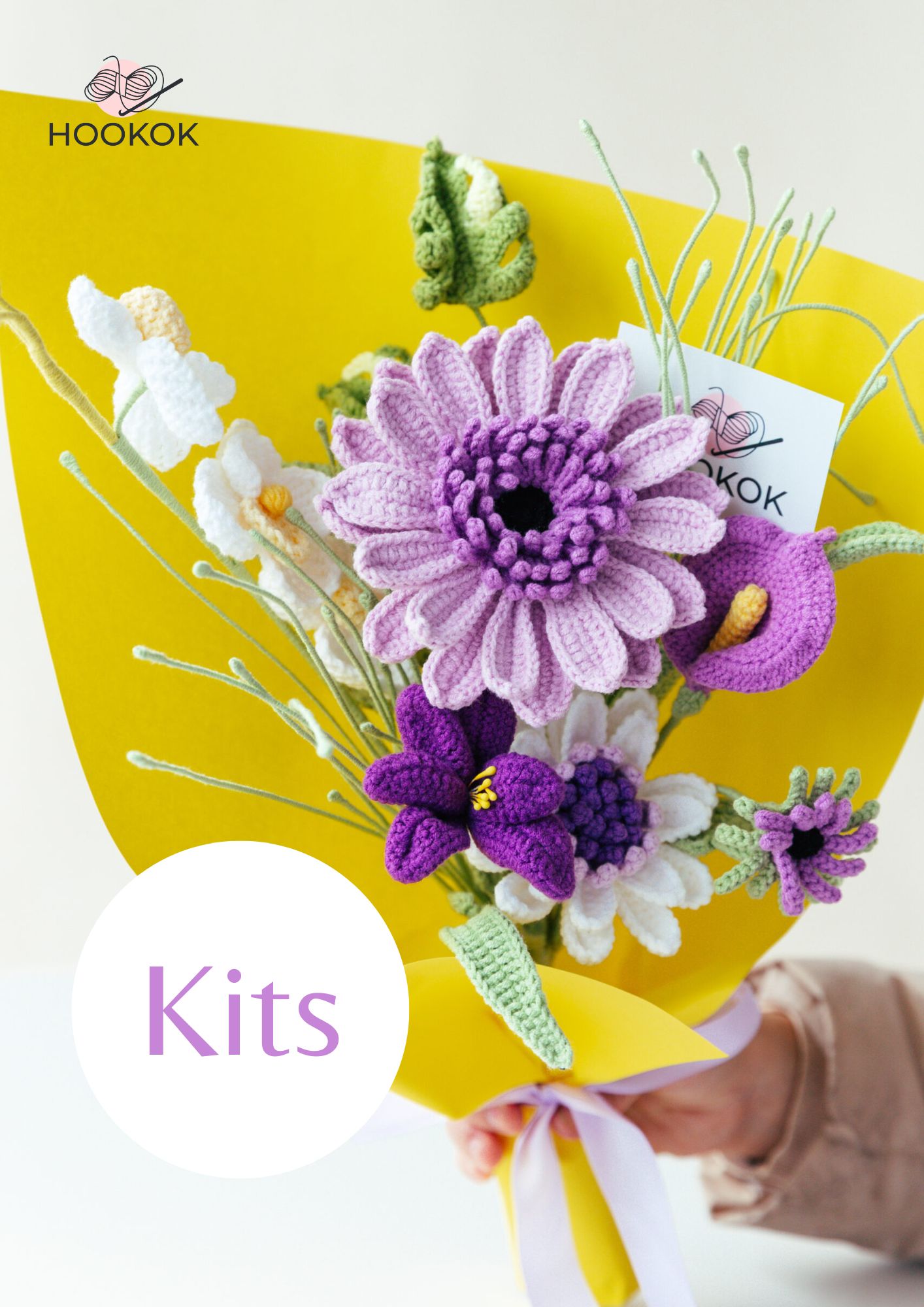 Our Crochet Purple Barberton Daisy Bouquet Kit include all the tools and yarns you need, very friendly for crocheters. In addition, we will offer you free patterns (a printed book and PDF) and video tutorial of the flowers. DIY crochet flower at home, crochet flower bouquet kit.