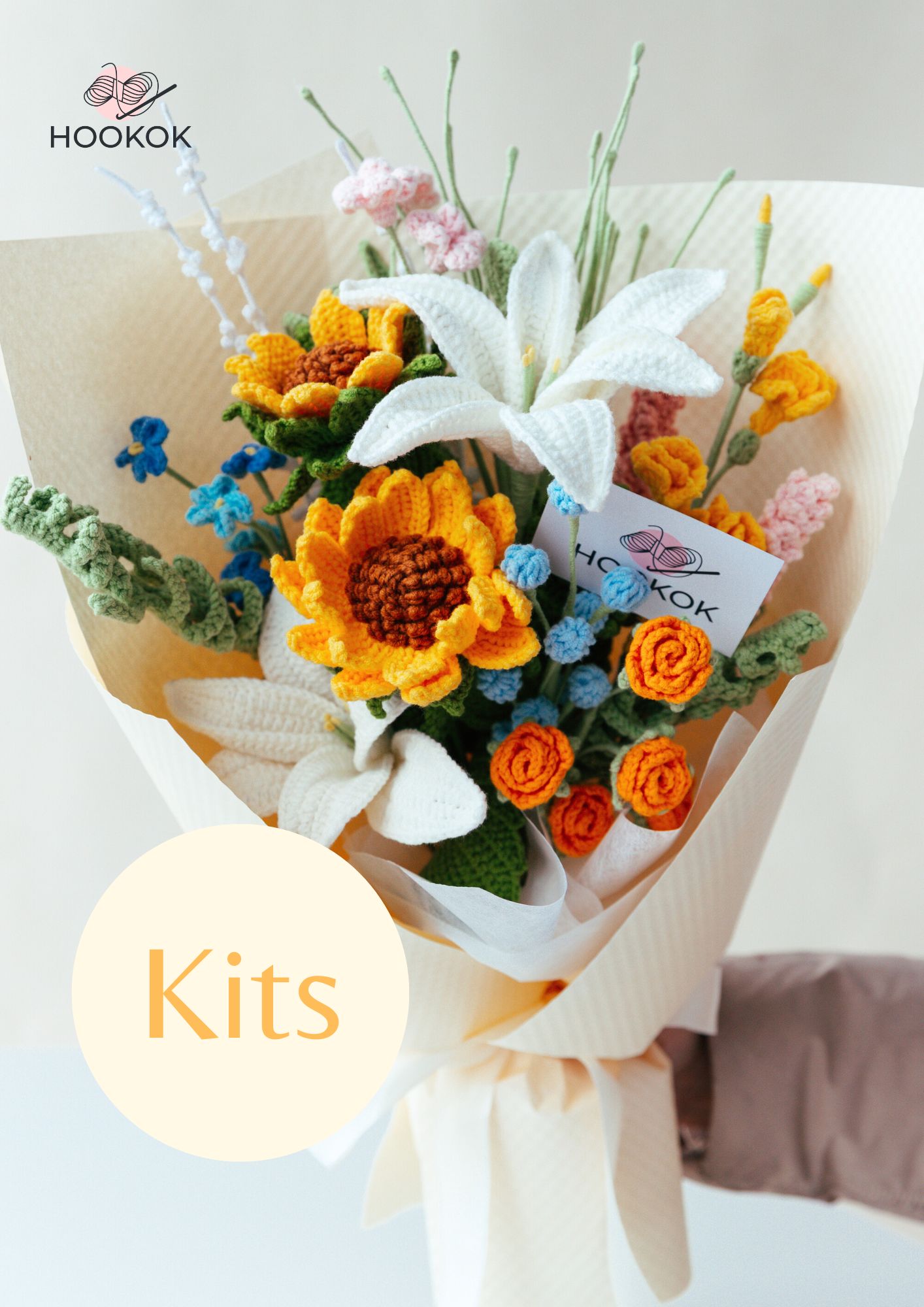 This is an all-in-one Crochet Yellow Lemon Queen Sunflower Bouquet Kit. With this one, you can crochet 1 yellow lemon queen sunflower, 2 white lilies, 1 orange multi-headed rose, 1 pink wood sorrel flower, 1 pink and 1 dark pink lavender, 1 yellow freesia, 1 blue forget-me-not, 1 blue snow fruit branch, 1 white lavender branch, 2 deer fern, and 1 fountain grass.
