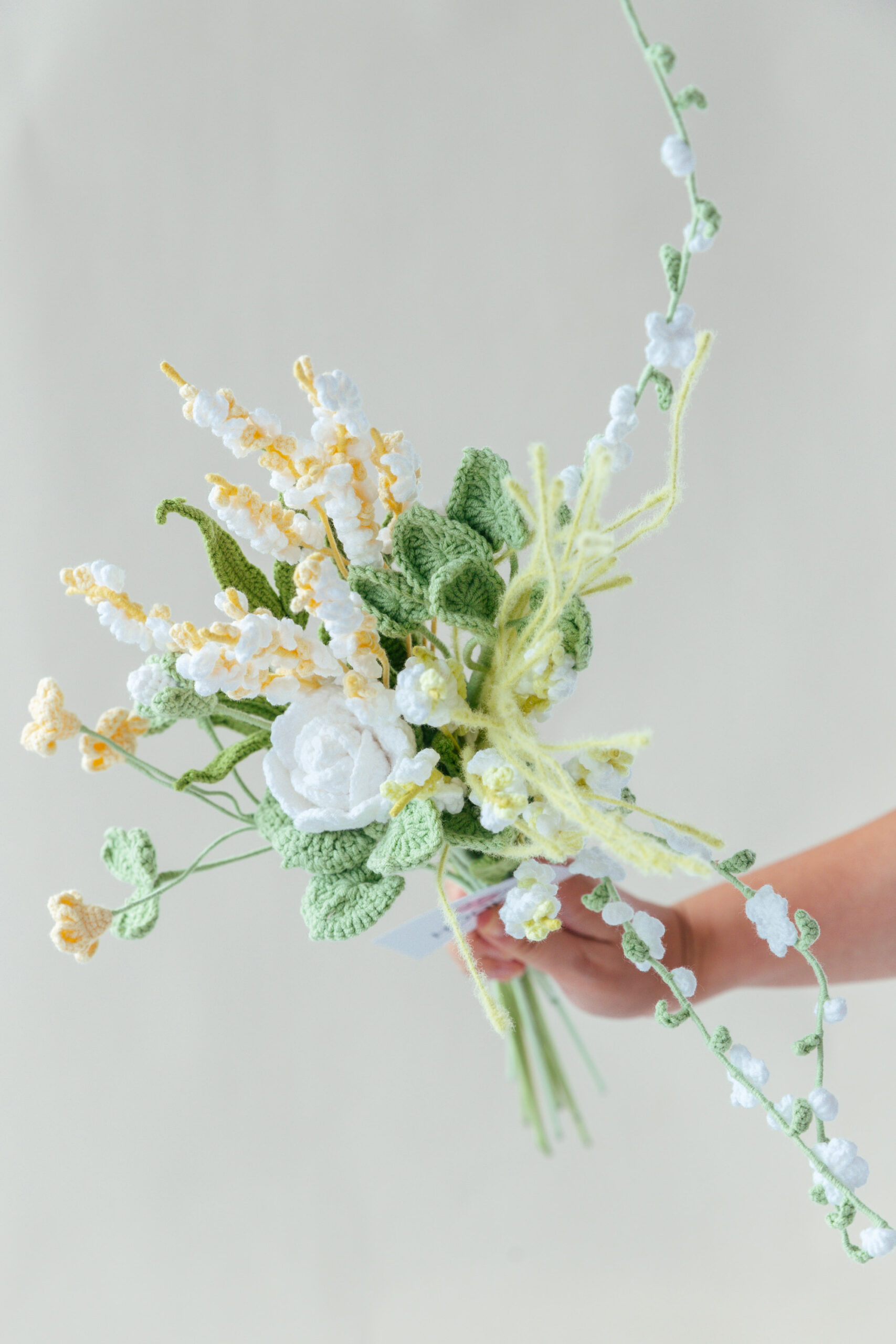 This is an all-in-one Crochet Yellow Water Pepper and Rose Bouquet Kit. With this one, you can crochet 4 yellow and 2 cream yellow water pepper; 1 white memorial rose, 1 yellow wood sorrel flower, 3 white blooming snow willow, 1 fountain grass, 1 bamboo leaf, and 1 ginkgo leaf.